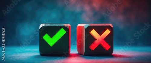 Symbols of right and wrong on wooden cubes set against a background. Evaluation of exams or tests, approval or disapproval, voting yes or no, and decision-making concept of positive or negative.