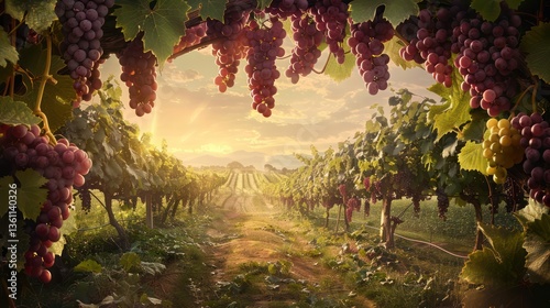 A symbolic composition of a vineyard with ripe grapes hanging from the vines, representing Jesus Christ as the true vine.