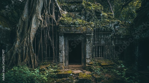 Ancient temple overgrown with massive tree roots in a lush forest during early morning light