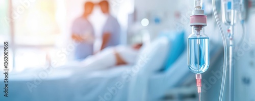 Medical fluid intravenous IV drip for patient in hospital room. Medical professionals in a hospital setting with an IV drip in focus, conveying care and support in a healing environment.