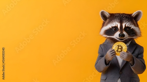 A resourceful and innovative raccoon dressed in a suit holding a shiny gold Bitcoin cryptocurrency coin representing the entrepreneurial spirit and digital financial opportunities