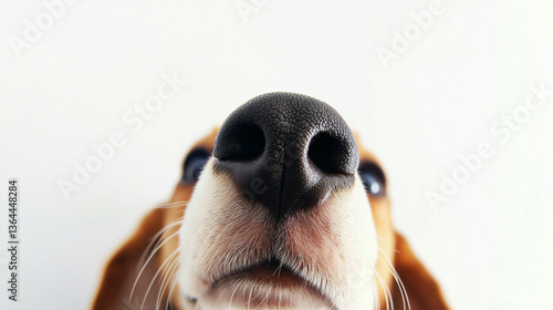 Beagle puppy wide angle nose close up white background cute sleepy dog face looking funny animal pet adorable expression minimal studio portrait photography concept look sniff calm paws banner advert