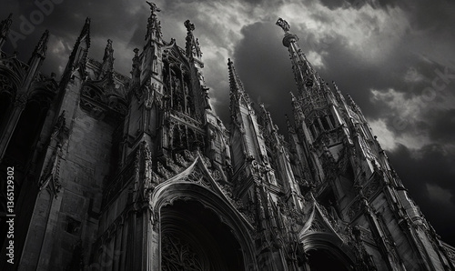 Majestic gothic cathedral spires reaching towards a dramatic cloudy sky, black and white