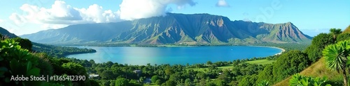 Scenic view of Hawaii's majestic mountains surrounded by lush greenery and clear blue skies, summit, tropical