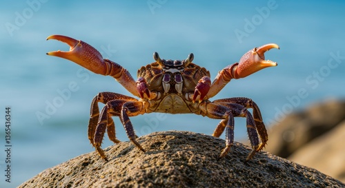 Crab on the beach under a blue sky with close-up details of its red shell, claws, and legs by the ocean