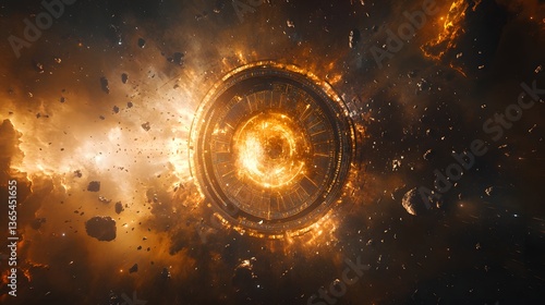 Dramatic space station explosion illuminating the dark abyss of outer space with fiery energy and cosmic chaos