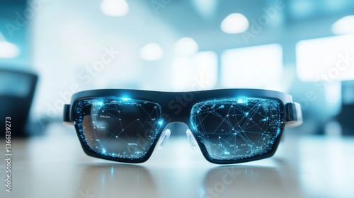 An AI powered smart glasses providing real time translation and augmented reality overlays, modern office setting with real-time data visualization and language processing, Wearable technology style