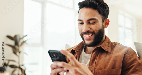 Online, mobile and happy man relax in home for social media app, message response or reading ebook. Smartphone, sofa and person on website for communication, chat notification or news on internet