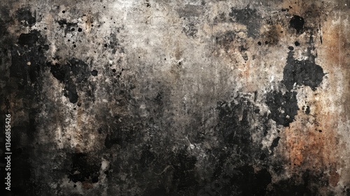 A heavily textured surface featuring various dark stains and patches, adding a grungy and worn-out appearance to the wall. illustration