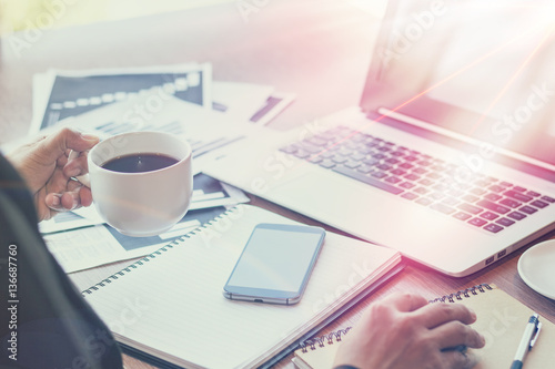 Close Up of woman hands using mobile phone and laptop computer with blank copy space screen for your advertising text message or content business in the Vintage effect.