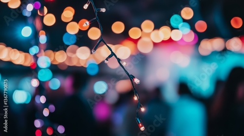 Colorful string lights illuminate a lively gathering in a festive environment during the evening