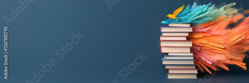 A high-resolution digital art piece of books stacked against a dark blue background, vibrant pencil