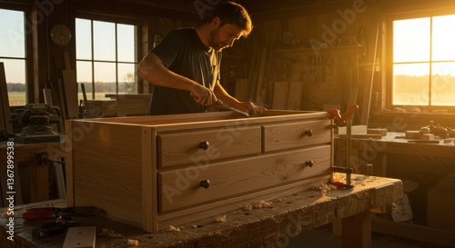 Craftsman Building Wooden Chest of Drawers in Sunset-Lit Workshop