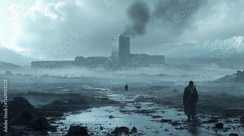 Post Apocalyptic Icy Landscape with Two Figures Walking Towards a Smoke Filled Building