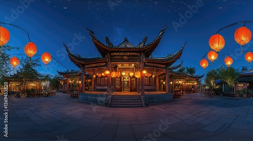 A panoramic view of a traditional Chinese temple with red lanterns glowing under the night sky, representing cultural heritage.