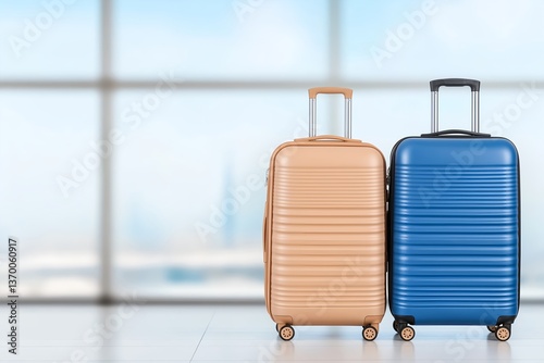 Stylish Blue and Beige Luggage Near Panoramic Airport Window, Travel Suitcases in Terminal, Modern Travel Concept, Transportation, Vacation, Tourism, Airline Journey, Business Trip, Copy Space