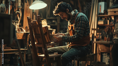 A skilled woodworker carving a wooden chair by hand, using traditional tools, in cozy artisan workshop