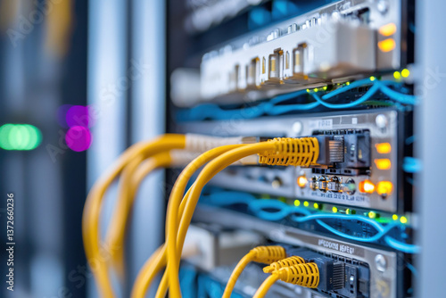 High tech network equipment with yellow cables connected, showcasing modern technology