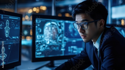 An AI engineer developing machine learning algorithms for real time social media analysis, high-tech data center with live social media data, High-tech style