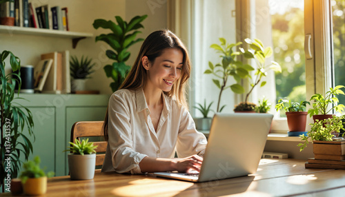 Woman in white shirt smiling at laptop during golden hour. Remote work setup with wooden table, houseplants, and sunshine through window. Biophilic home office with indoor garden of potted plants.