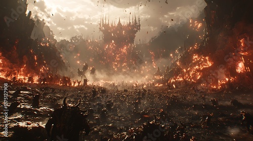 A massive battlefield where a horde of monstrous demons charges against an army of celestial warriors. The demonic soldiers, with grotesque horns and skeletal armor, wield dark blades and chains,