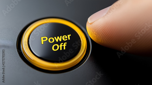 the action of a finger pressing the power off button, representing shutdown or termination. A close-up shot captures the button and the fingertip