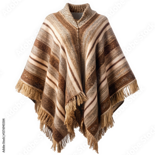 A stylish, knitted poncho in earthy tones of brown and cream, featuring elegant fringe detailing, perfect for cozy autumn days.