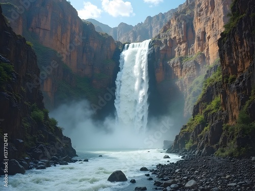 Waterfall in a Rocky Canyon: A dramatic waterfall crashing down the rugged cliffs of a deep canyon, carving its way through ancient rock formations.