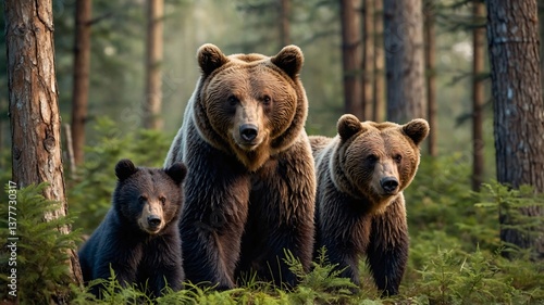 A family of three brown bears stands majestically in a lush forest, showcasing their powerful presence in nature.
