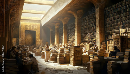 AI generated image depicting inside of the ancient library at Alexandria 2000 years ago. Students and scholars reading from huge racks to papyrus scrolls. Walls covered with hieroglyphs