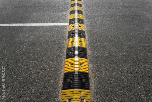 Progi zwalniające z wyraźnym oznakowaniem pasów. Detal miejskiej infrastruktury drogowej