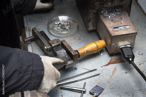 Rzemieślnik w zakładzie produkuje elementy do maszyn Manufaktura, ręczna produkcja elementów ze stopu ołowiu Rzemieślnik wyciąga gotowy wyrób z formy