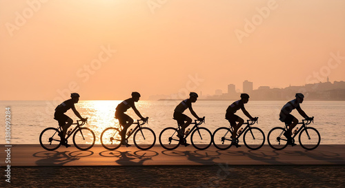 A group of road cyclists rides in formation along a seaside bike path at dawn, symbolizing teamwork and endurance.