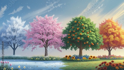 Trees showing four seasons in row, from winter frost to summer fruit. Snow, blossoms, oranges, and autumn leaves highlight seasonal shift.