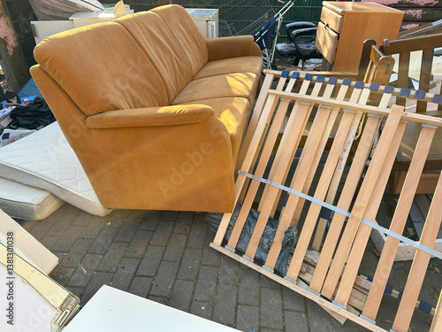 Discarded household items in messy pile on street, broken furniture, renovation, minimalism, and sustainability, collecting and recycling bulky waste to reduce environmental pollution