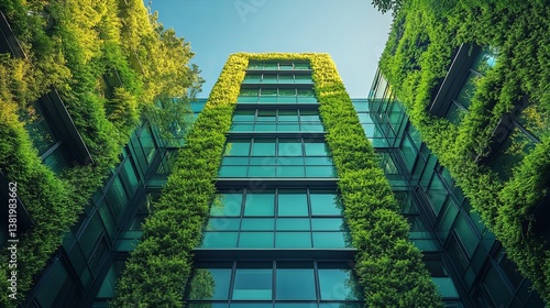 Modern Green Building Exterior Sustainable Architecture Design Eco Friendly Urban Development Tall Glass Facade Lush Vertical Greenery Natural Plants Cityscape Image sky real view photo walls tower