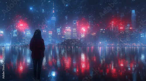 Solitary Figure Witnessing a Spectacle of Fireworks over a Futuristic Cityscape