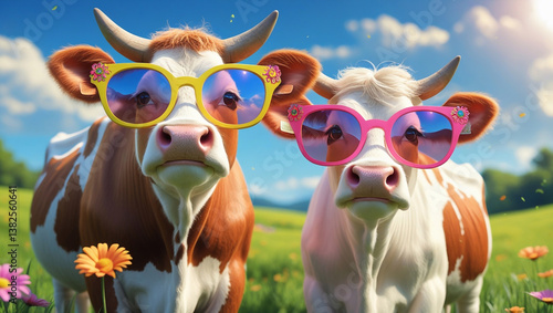 Two adorable cows in trendy oversized sunglasses stand next to each other, radiating infectious joy and friendliness