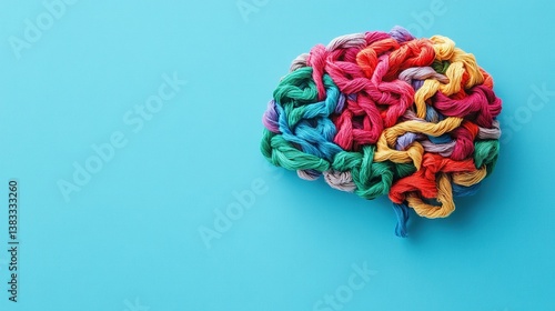 A human brain made of colorful tangled threads on a blue background with a banner for copy space. Concept of neurodiversity and mental problems