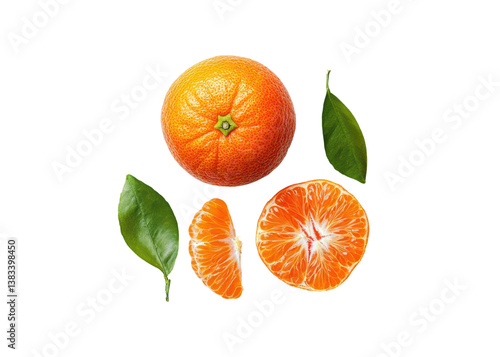 Fresh tangerines with leaves, half tangerine and a slice on a transparent background. Concept of healthy eating, vitamins, and citrus fruits.