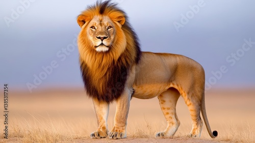 A dominant male lion standing tall with his powerful mane blowing in the wind as the sun sets