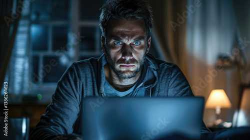 angry frustrated thin man sitting in dark room at laptop, cheater, incel, depressed person, stress, negative emotions, psychological problem, burnout at work