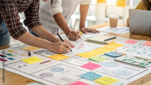 Diverse Team Sketching Design Layouts on Table with Sticky Notes and Charts