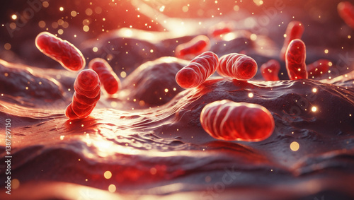 E. coli Bacteria in Warm Red-Gold Environment with Dynamic Background