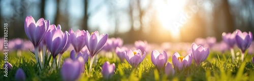 Spring crocus flowers blossom. Purple petals, green grass. Sunbeams illuminate floral scene. Early spring, vibrant colors, seasonal beauty, nature, garden. Perfect for Easter, gardening tech, botany,