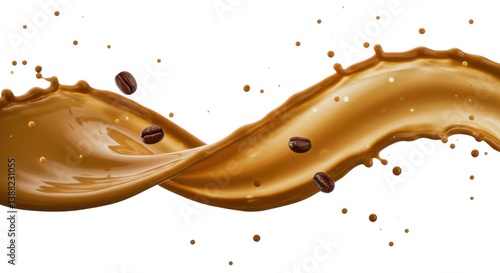 Liquid coffee splash with scattered beans on a bright surface