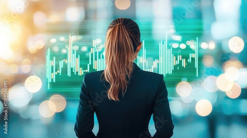 Green stock market chart with business and industry finance concept. Woman analyzing financial data on digital screen in office.