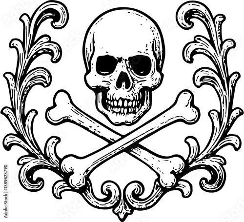 Nautical ornament. A human skull with crossed bones Vintage illustration
