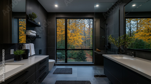 Tranquil Bathroom with Nature View: A luxurious and modern bathroom featuring a sleek design with a window offering a stunning view of colorful autumn trees, embodying peace and serenity.
