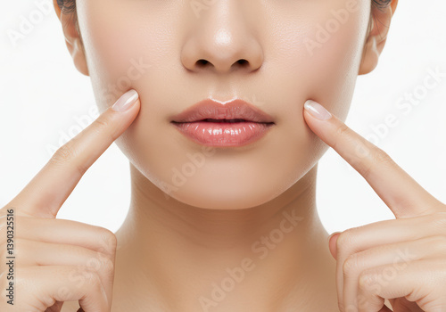 頬に指をあてハリと潤いを指先で感じる若い女性